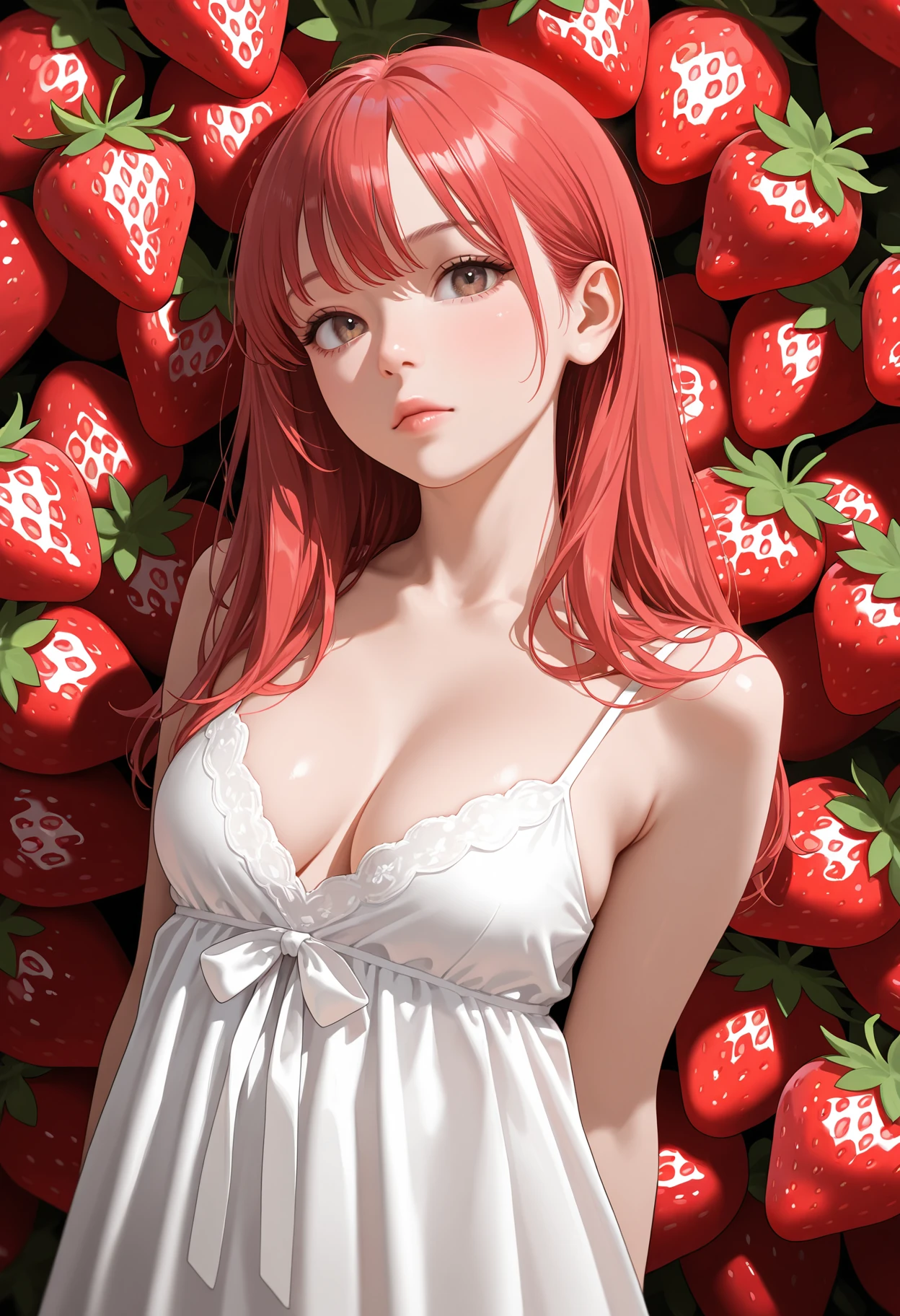 1girl, dress, masterpiece, best quality, absurdres, very aesthetic, realistic, strawberry background