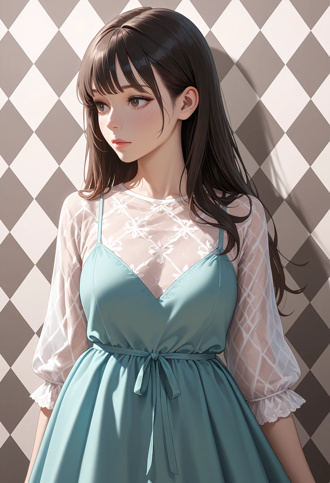 1girl, dress, masterpiece, best quality, absurdres, very aesthetic, realistic, argyle background