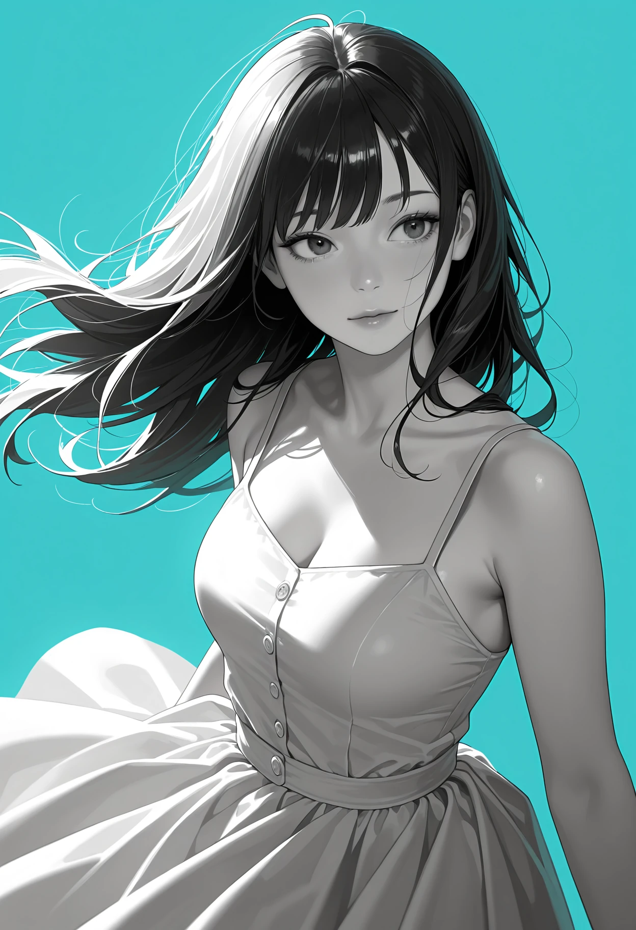 1girl, dress, masterpiece, best quality, absurdres, very aesthetic, realistic, greyscale with colored background